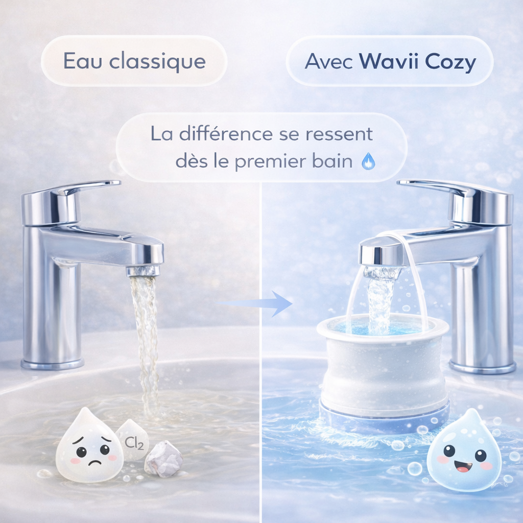 Découvrez comment Wavii Cozy transforme l’eau du bain en une eau plus douce, et plus respectueuse de la peau fragile de votre bébé.